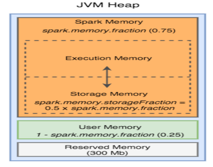 - spark.memory.fraction - It is the fraction of heap space which is used for execution and storage. By default its value is set to 0.75 rest is the user memory.